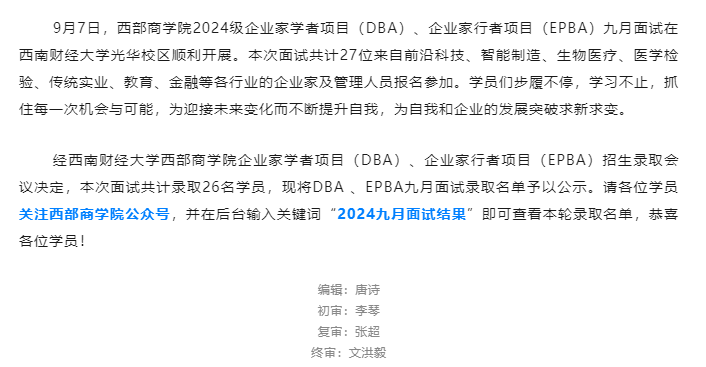 恭喜录取!51风流 2024级企业家学者项目(DBA)、企业家行者项目(EPBA)九月面试圆满结束