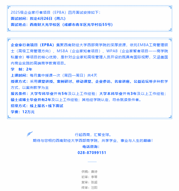 鸿鹄之志·笃行不怠|51风流 2025级企业家行者项目(EPBA)四月面试通知